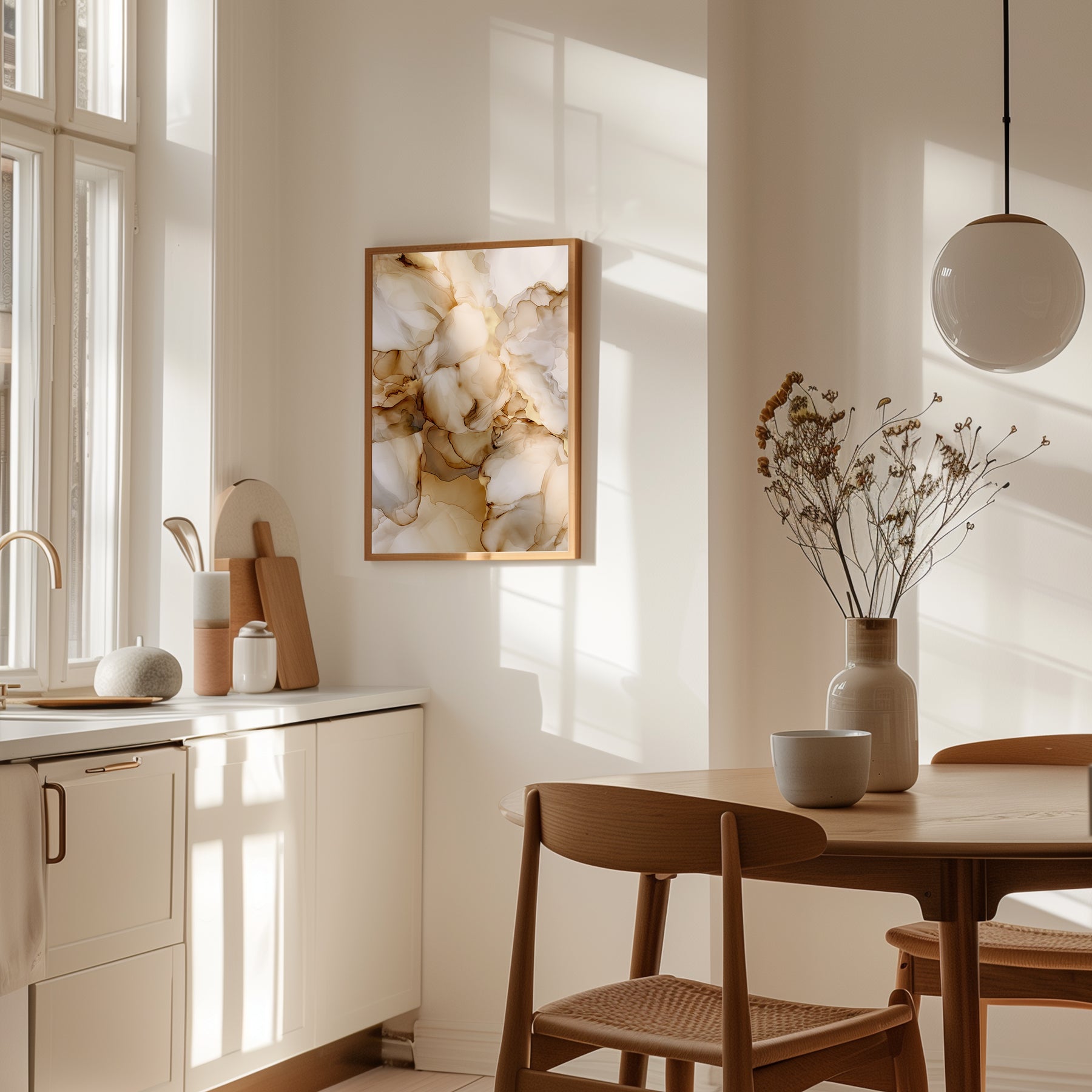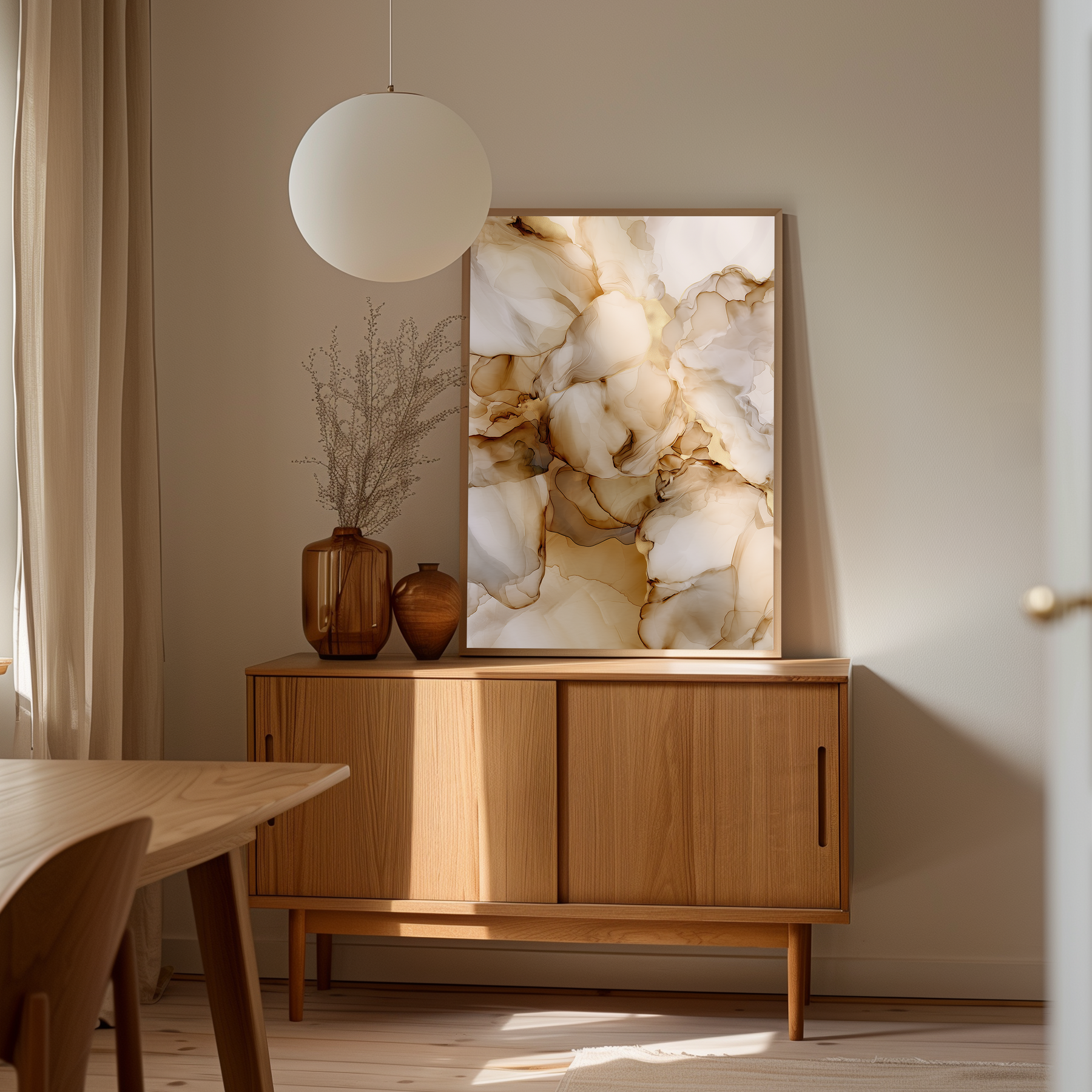 En plakat der forener storbyens energi med et tidløst design. De gyldne årer og lyse beige nuancer skaber et dynamisk og elegant udtryk, der tilføjer varme og liv til din indretning – uanset om den hænger i stuen, kontoret eller entreen.
