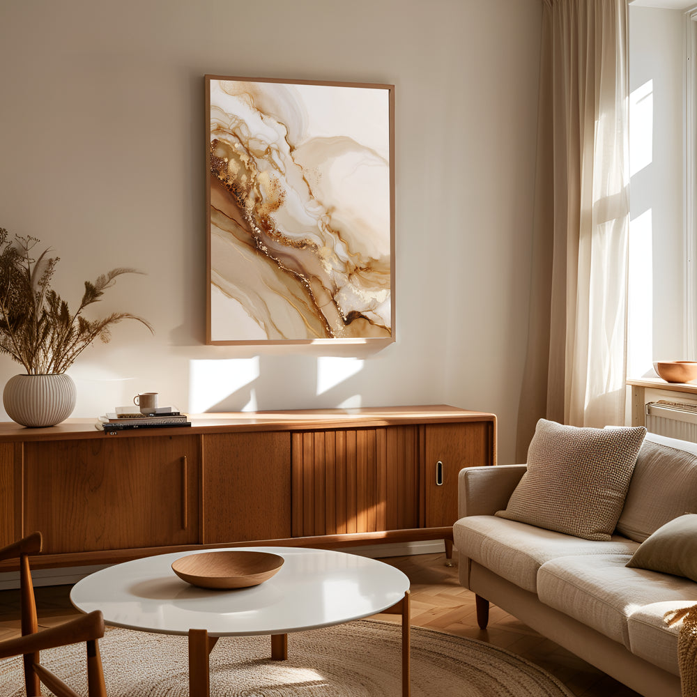 En plakat der bringer varme og lys ind i dit hjem. De gyldne årer i kombination med bløde beige nuancer skaber et elegant og roligt udtryk, der gør sig smukt i både stuen, spisestuen og soveværelset.