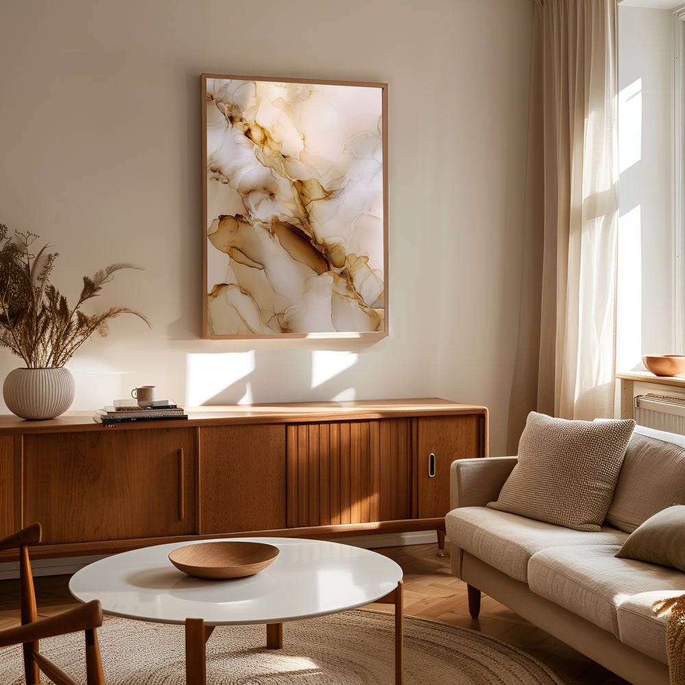 Et kunstværk inspireret af jordens naturlige former og farver. De gyldne årer kombineret med varme beige toner giver et organisk og roligt udtryk, der skaber balance og dybde i dit hjem.