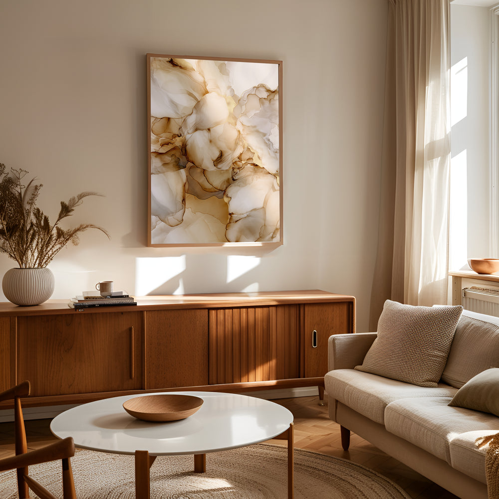 En plakat der forener storbyens energi med et tidløst design. De gyldne årer og lyse beige nuancer skaber et dynamisk og elegant udtryk, der tilføjer varme og liv til din indretning – uanset om den hænger i stuen, kontoret eller entreen.