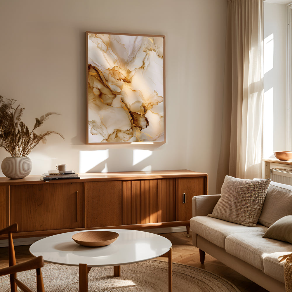 En plakat der fanger spillet mellem lys og struktur. De gyldne årer kombineret med lyse beige nuancer giver et elegant og friskt udtryk, der passer smukt ind i alt fra stue og køkken til soveværelse.